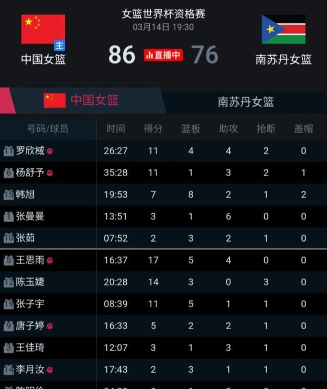 中國新聞網:《世界杯資格賽:中國女籃86:76戰勝南蘇丹隊》2026年3月15日抖音短視頻:《@FIBA國際籃聯——第88集:#王思雨裏突外投單節砍下12分,幫助球隊將分差越拉越大,第三節比賽結束#中國女籃70-51領先南蘇丹女籃》2026年3月14日抖音短視頻:《@咪咕體育——恭喜!中國女籃86-76戰勝南蘇丹女籃,王思雨拿下17分,陳玉婕14分,張子宇11分5板》2026年3月14日懂球帝:《南蘇丹女籃主帥:中國女籃是世界最強之一,感謝球員們沒放棄》2026年3月14日