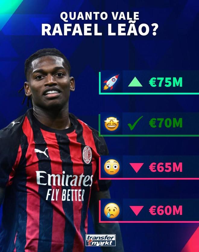 北京時間3月17日,德轉預熱了AC米蘭前鋒拉斐爾-萊奧的身價更新,他們給出了四個選項,最高漲至7500萬歐元,最低跌至6000萬歐元。