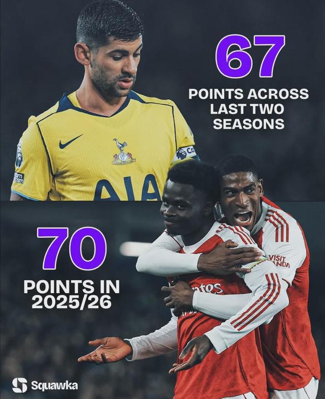 Squawka統計,戰勝埃弗頓之後,阿森納本賽季英超積分達到70分,比熱刺最近兩個賽季的積分總和還多!