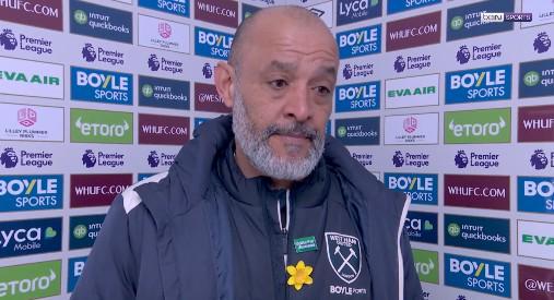 英超第30輪,西漢姆聯主場1-1戰平曼城,西漢姆聯主帥努諾賽後接受了拜因體育的采訪。